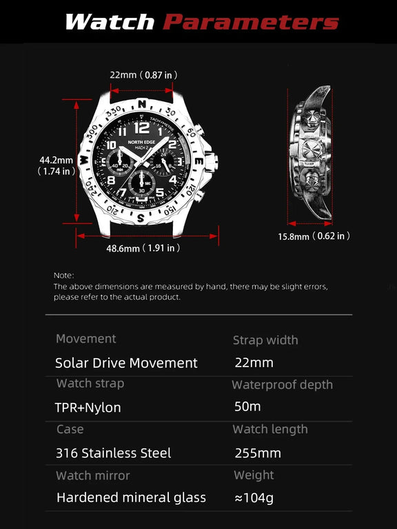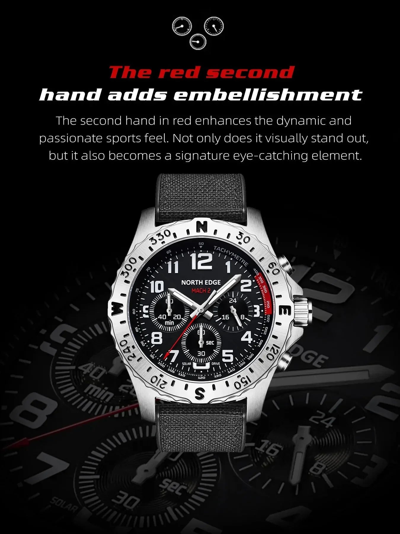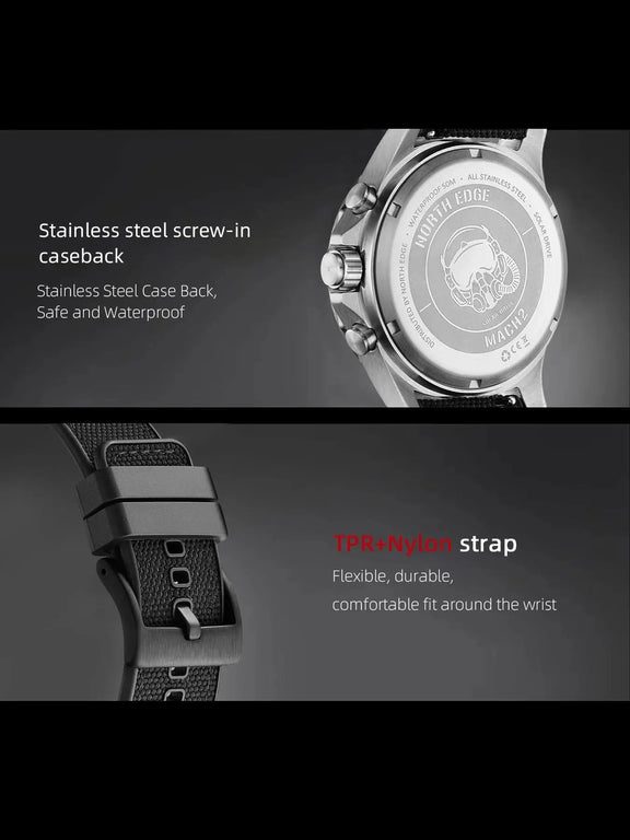 Discover the ultimate blend of style, durability, and advanced technology with the Solar Aviator Chrono - Mach 2 Edition. Crafted for those who demand excellence, this timepiece is designed to take your wristwear to new heights. Powered by solar movement and housed in a sleek 316 stainless steel case, this watch is not just about looks – it’s built to perform.