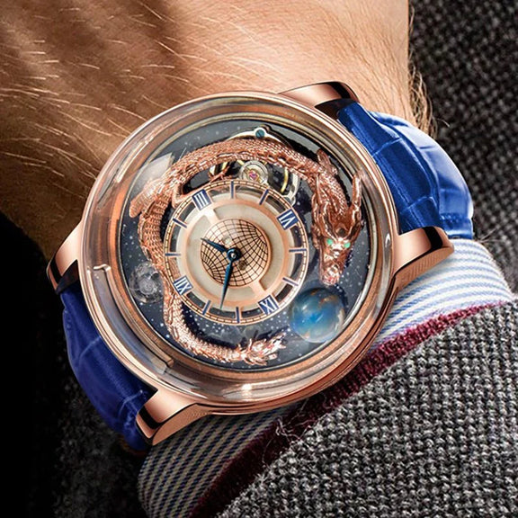 Also known as the Mystic Dragon Tourbillon, turn heads instantly with the Big Bang Dragon Tourbillon, a luxury timepiece designed for the modern connoisseur. Crafted with precision by Pindu for Shark & Sapphire, this watch features a durable stainless steel case and a genuine leather band, ensuring both elegance and comfort. The 46mm round dial, protected by sapphire crystal, offers exceptional clarity and scratch resistance. With a water resistance of up to 5Bar, this watch is perfect for any adventure. The quartz movement guarantees accurate timekeeping, while the luminous hands and shock-resistant features provide functionality and durability. Certified by CE, the Big Bang Dragon Tourbillon is more than a watch; it's a statement. Experience luxury with every glance.