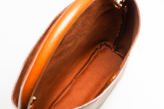 Embrace sustainable luxury with this Semi-Vegetable Tanned Full-Grain Leather Bucket Bag, where craftsmanship meets functionality in every stitch.